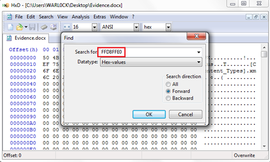 In the above figure, we can see the raw hexadecimal data that forms the Word document. Within this block of raw data, we can search for the JPG file signature to show us the location of the first JPG image. As we already know, any JPG file starts from header with value of FFD8FFE0