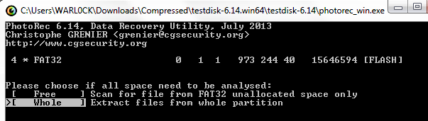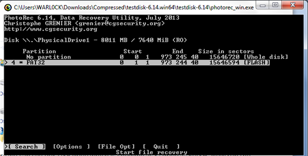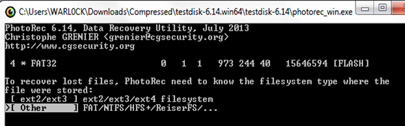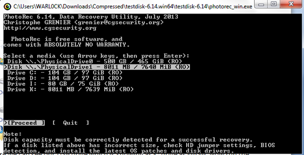 Here we can see our USB drive, which is showing as FLASH on K: drive. Now run the photorec_win.exe program.