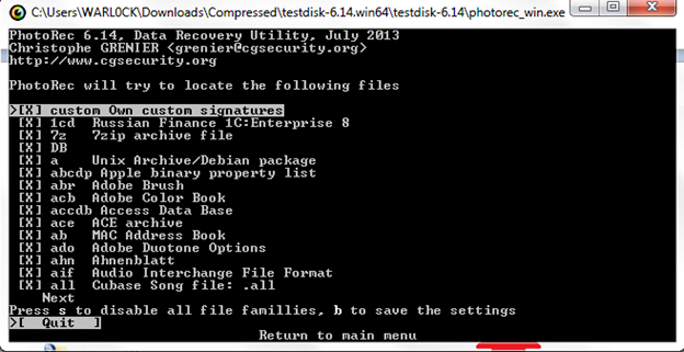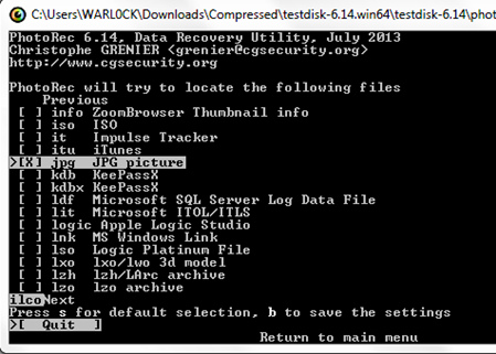 This option is for selecting the file types to be recovered. Press S to disable all file type format selections. Here we will recover only jpeg file types because it will take a long time to recover all types of file.
