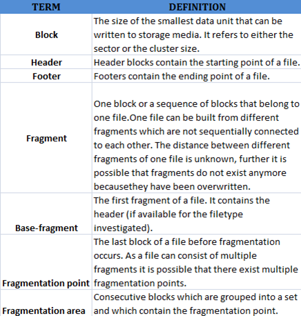 File Carving Techniques: During digital investigations, various types of media have to be analyzed. Relevant data can be found on various storage and networking devices and in computer memory. Various types of data such as emails, electronic documents, system logs, and multimedia files have to be analyzed. In this article, we focus on the recovery of multimedia files that are stored either on storage devices or in computer memory using the file carving approach. File carving is a recovery technique that merely considers the contents and structures of files instead of file system structures or other meta-data which is used to organize data on storage media. The below figure summarizes the file carving terminology.