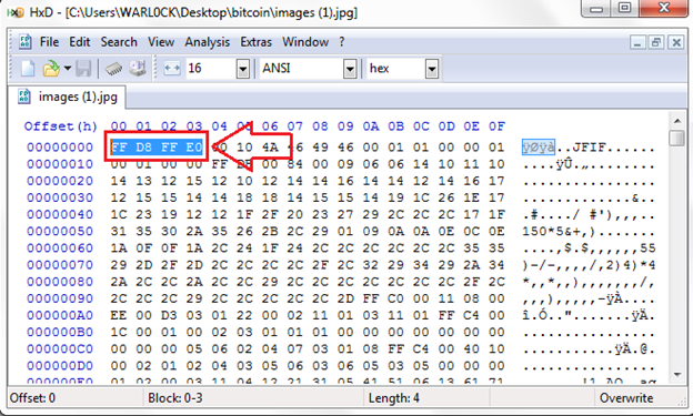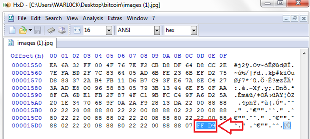 Now we have the header and trailer of a jpeg file and, as we previously said, between the header and trailer is the data of a jpeg file. Now we copy the whole block of data with header and trailer and store it as a new file.