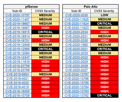 Using the NIST’s National Vulnerability Database (NVD) as a basis, both vendors had significant security flaws over the last couple of years. Taking into consideration the CVSS severity for the last 20 reported items, pfSense had at least two critical and 10 high vulnerabilities, while Palo Alto had at least three critical and 11 high security flaws.