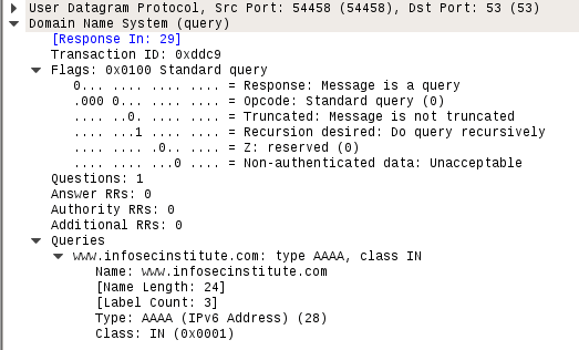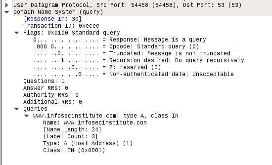 - Under Queries, you can see that the request is made for www.infosecinstitute.com for record type A in internet (IN) class.