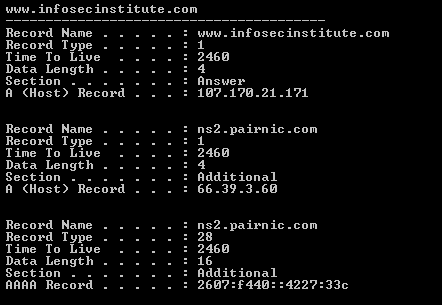 For example, below we are using nslookup on infosecinstitute.com