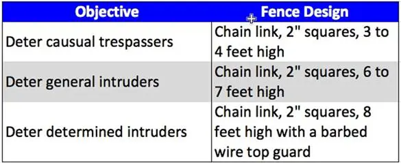 When landscaping and natural barriers do not sufficiently mitigate risk, one of most common choices is fencing. As shown in Table 13-1, fencing characteristics should match the threat type you want to deter and delay. In most cases, an organization is safe enough with one of the chain link designs shown in the table. According to the U.S.G.S (2005), chain link should consist of a mesh of 11-gauge or better wire. To deter an intruder attempting to go under the fence, the bottom links should be no higher than two inches from firm ground. In addition, installers should embed fence posts in concrete, as shown in Figure 13-4.