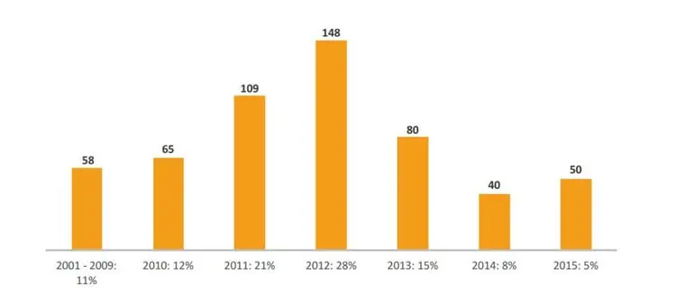 The percentage of vulnerabilities in SAP J2EE remains almost the same in comparison to the total number of vulnerabilities and ranges between 7 to 20 percent. However, the actual number of vulnerabilities is decreasing after its peak in 2012.