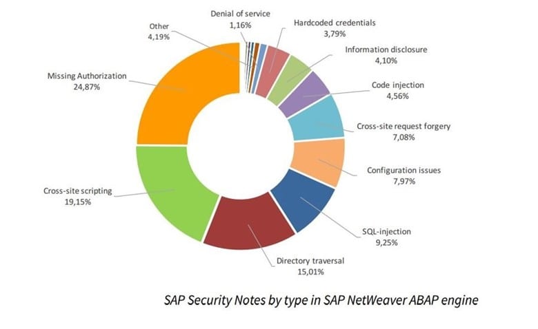 As illustrated, 2585 issues were patched in this platform. We carry out our annual research called "SAP security in figures." The picture provides some statistics such as information about different types of vulnerabilities.