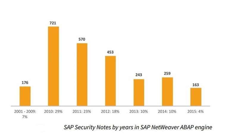 The upper graph of another statistics presents the number of vulnerabilities in SAP NetWeaver ABAP platform by years; the bottom graph shows the percent of vulnerabilities in ABAP platform in comparison with the number of vulnerabilities found on other platforms. Two trends together demonstrate that research interest is shifting from this old platform to the newer ones. However, it still leads to the number of fixed vulnerabilities.