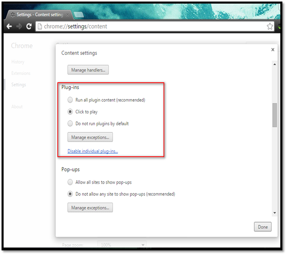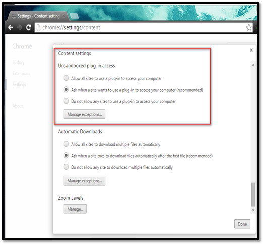 Navigate to Settings Privacy Content settings Configure options under "Unsandboxed plugin access" section.