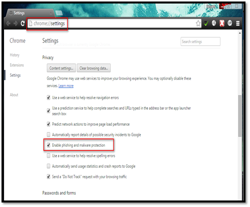 To enable these features, navigate to Settings Privacy. Select the "Enable phishing and malware protection" check box.