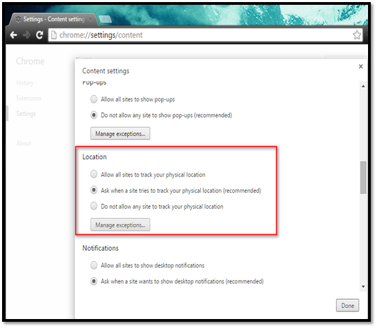 Select the "Ask when a site tries to track your physical location" option if you want Chrome to show a pop up asking to allow location tracking whenever a website tries to access your current location.