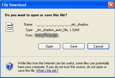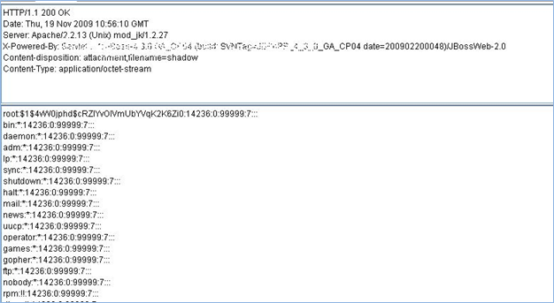 The above is an example of an ideal situation whichis not always the case. If in the code the developers have not properly validated the input from the user before assigning it to the 'filename' parameter, the consequences can be disastrous. If the user simply supplies'../../../etc/passwd'or '../../../etc/shadow', they can download the server's login information from the system, which can eventually be used to retrieve a valid user's account and finally connecting and owning the server, which I shall show in a real scenario that I came across. On a successful exploitation, any file present on the server can be downloaded based on the account privileges in which the server is running. In this case, as the application server is running as the highest privilege user (root) on the system, we were able to obtain a copy of the shadow file.