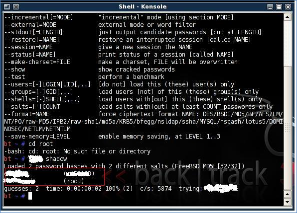 - We used a cracker tool called 'John the ripper' to retrieve the password in plain text. It's available on Backtrack versions. We provided the 'shadow' file as input and cracked it in minutes. We got two user accounts, 'root' was one of them [Figure 6]: