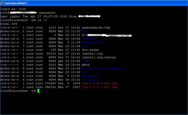 - We used Putty to connect to the remote server using retrieved 'root' account. And voila, we logged on to the remote server used for hosting the web application. We could see various files, which could be a treat to an attacker's eyes. We could list various log files such as install.log and install.log.syslog. [Figure7]