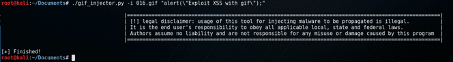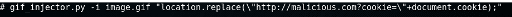 Then, let's inject our test script into the image with the following command (we will do the test with a gif image so that we will use the gif injector script ➔ The first one). This is just a simple payload that will show you a JavaScript alert with the message "Learn XSS with gif," but in a real scenario, an attacker will try to steal your cookie, inject hook (like BEeF one), redirect you to a malicious site such as:
