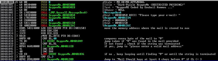 As you see, I tried to write short comments in front of important instructions. So what the KeygenMe does with our e-mail, is checking for its validity by seeing if it has the "@" sign in it and if there are at least 4 characters before the @ sign.
