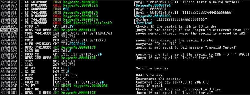 You can clearly see that the KeygenMe will check the input length, check if the string « ITS– » is present then locate 3 more dashes (–). As a result the serial general format should be given by the user this way : ITS-XXXX-XXXX-XXXX-XXXX, where ITS– is a harcoded string and X's are unknown for us in the mean time.