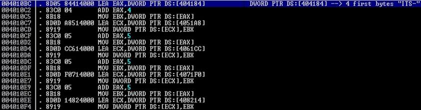 This set of instructions will simply skip the first DWORD which is "ITS-" and place each of the fourth different parts of the serial in an seperated memory location. For example the first part of the serial which will come after the hardcoded string, will be placed in a DWORD that is located in memory address 004051A8.