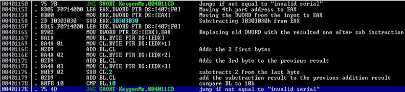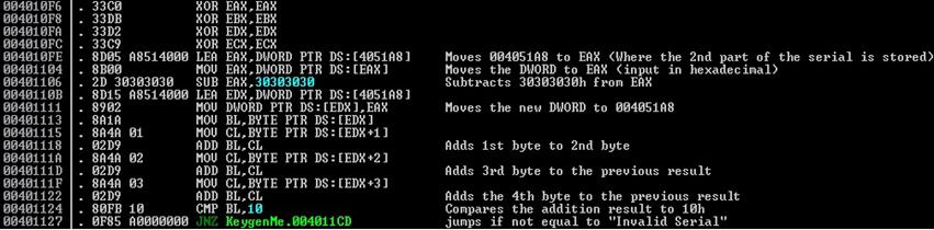 As you can clearly see the KeygenMe works on moving the DWORD in the first part into EAX register, our input is "1111" so the EAX register should hold "31313131" which is the translation of "1111" from ASCII into a Hexadecimal format. Now twill substract « 30303030 » from EAX resulting in « 01010101 ».