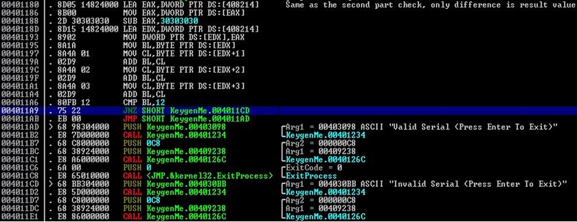 This value will replace the existing value in 004051A8. Now, the KeygenMe will try to do a simple addition between those bytes : 01 + 01 + 01 + 01 = 04 which is not 10h, that's why we will jump into the "invalid serial" message.