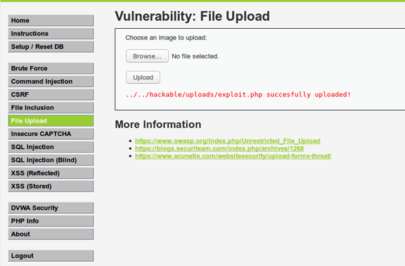For this example, we will be using the DVWA's File Upload challenge. Here is how it looks like: