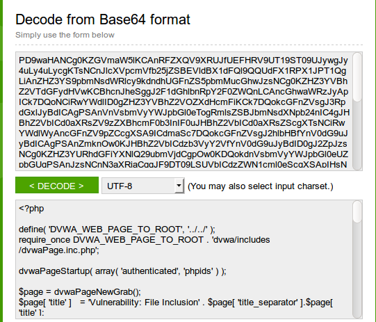 This will return the contents of the index.php file instead of including it - which is the same as executing it. The output will be in Base64 and thus, you will need to decode it. Here is an online decoder: Base64 Decode