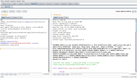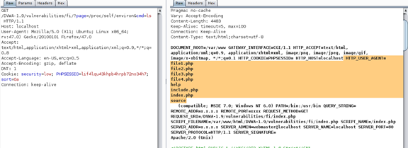 Again, on updated systems, we won't be able to access the file from the vulnerable application. Supposing we are dealing with an outdated OS, trying to include the /proc/self/environ file will result in something like this: