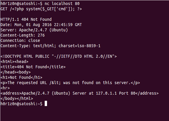 What we have to do to gain a reverse shell is to create manually an HTTP request with a malicious code included. This malicious code will be then inserted into the apache log file. On our terminal window we can do the following: