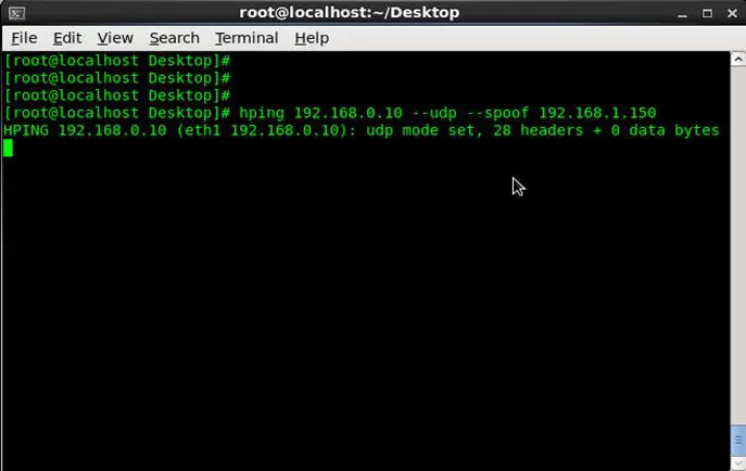 hping 192.168.0.10 --udp --spoof 192.168.1.150