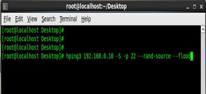 This command floods the port number 22 of the mentioned machine. As the flooding starts, the machine becomes non responsive. When the flooding is stopped, the machine comes back to its normal state.