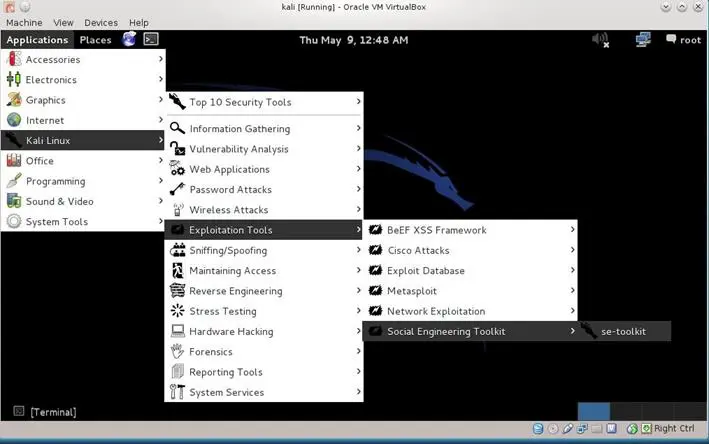 To open Social Engineer Toolkit (SET) in Kali distribution, Go to Applications -> Kali Linux -> Exploitation Tools -> Social Engineering Tools ->se-toolkit
