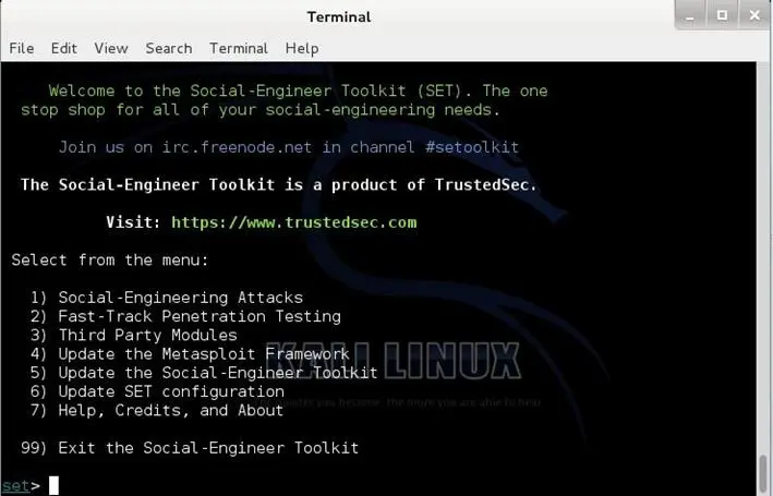 The SET will open in the terminal will look like the following screenshot (of course you have installed the latest version of SET).