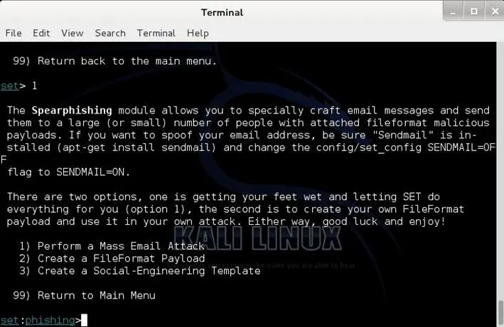 The Spear-phishing module allows you to specially craft email messages and send them to your targeted victims with attached FileFormatmalicious payloads for example (sending malicious PDF document which if the victim opens it, it will compromise the system). If you want to spoof your email address, be sure "Sendmail" is installed (apt-get install sendmail) and change the config/set_config SENDMAIL=OFF flag to SENDMAIL=ON.