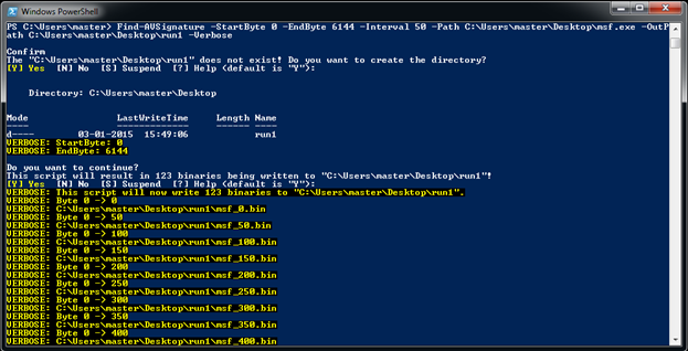 This cmdlet is used to split a file into specific byte sizes. The split bytes are stored in separate files, which will be detected by the installed antivirus and quarantined or removed. By noting the removed files, we can easily find the parts of file which have the AV signature.