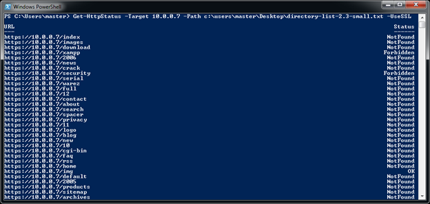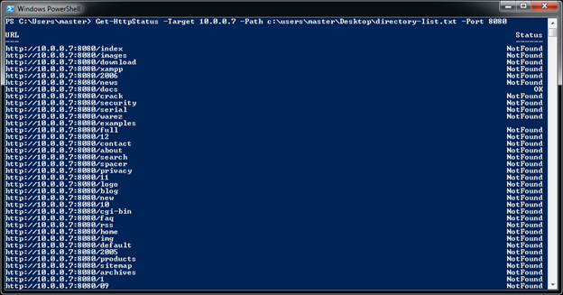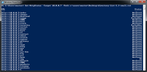 This cmdlet is used to dictionary a web server to find HTTP Status of a path or file on HTTP/HTTPS service. It is not very feature rich and does not support a nested dictionary attack. It accepts a file containing path name or file name to check for HTTP Status on a web server.