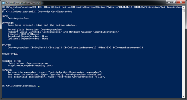 We can easily install the Exfiltration PowerShell script "Get-Keystrokes" using: