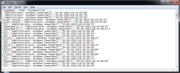 This script also supports "-CollectionInterval" using which you can define after how many minutes keystrokes should be captured. Do note that the key logging is very detailed, containing pressed button, username, application name and timestamp.