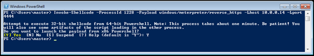 Inject the Metasploit payload into "svchost" process with PID 1228. Note that I have removed "-Force" switch from the command, due to which it is asking for user confirmation now before injecting payload.