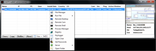 Once a victim is infected, the malware is also capable of scanning for other machines on the same network looking for other vulnerable machines to infect. Using that ability to move once inside a network coupled with the legitimate credentials and other data it harvests via its key logging capabilities, njRAT is a classic APT-style attack tool.