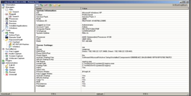 Poison Ivy is a remote access tool that include features common to most Windows-based RATs, including key logging; screen capturing, video capturing, file transfers, system administration, password theft, and traffic relaying.