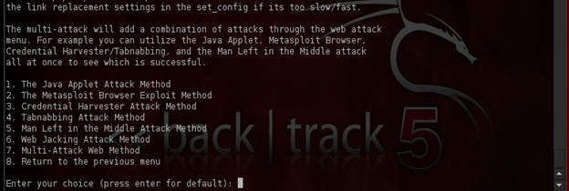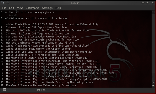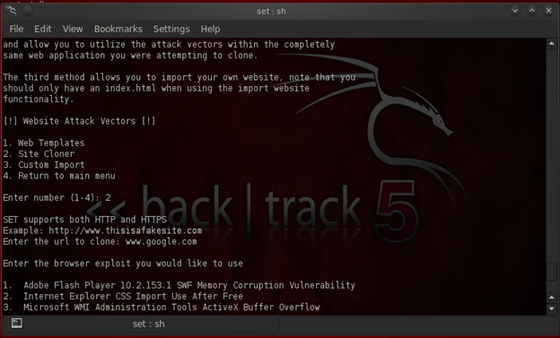 First, select the option 2 in the SET toolkit which says "website attack vectors". Once this option is selected, enter the option 2-site cloner and enter the site of our choice. Once entered, the SET framework will generate a fake webpage of the specified website.