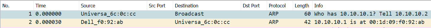 The meat of the ARP packet states the IP and MAC address of the sender (populated in both packets) and the IP and MAC address of the recipient (where the recipient’s MAC is set to all zeros in the request packet).