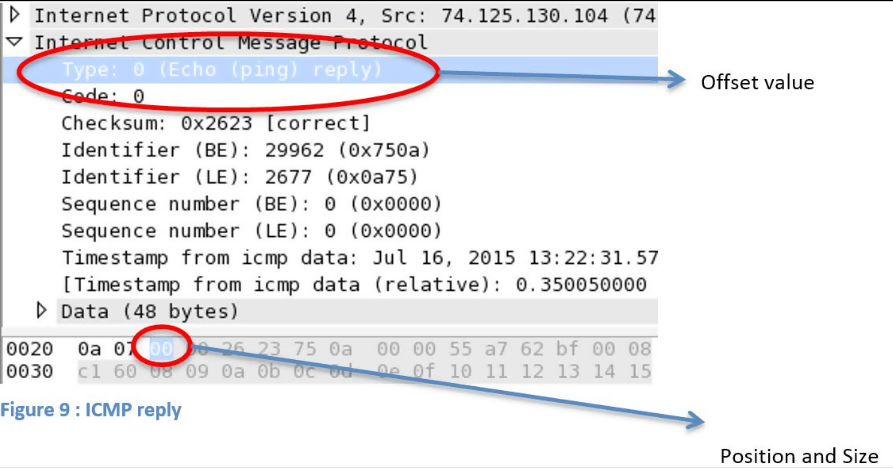 From the figure, we are able to tell that the offset counting begins at 0 and the size of the field is 1 byte. We can therefore build a capture filter by using the filter icmp[0:1]=0.