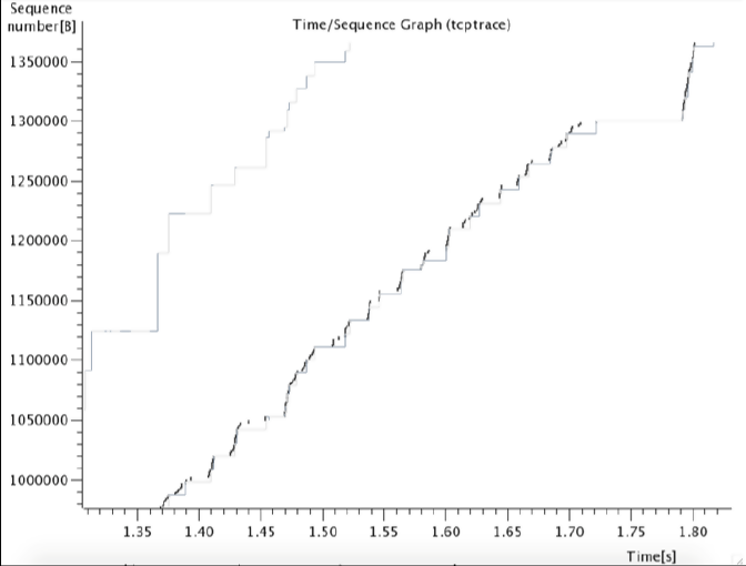 In the graph above, the y-axis represents the TCP sequence number and the x-axis represents the time in seconds. The TCP sequence numbers are incremented by the bytes sent with each packet. That is to mean that if the sequence number is 1 and the packet being sent has 10 bytes of data, the sequence number will be incremented by 10, making the next sequence number 11.