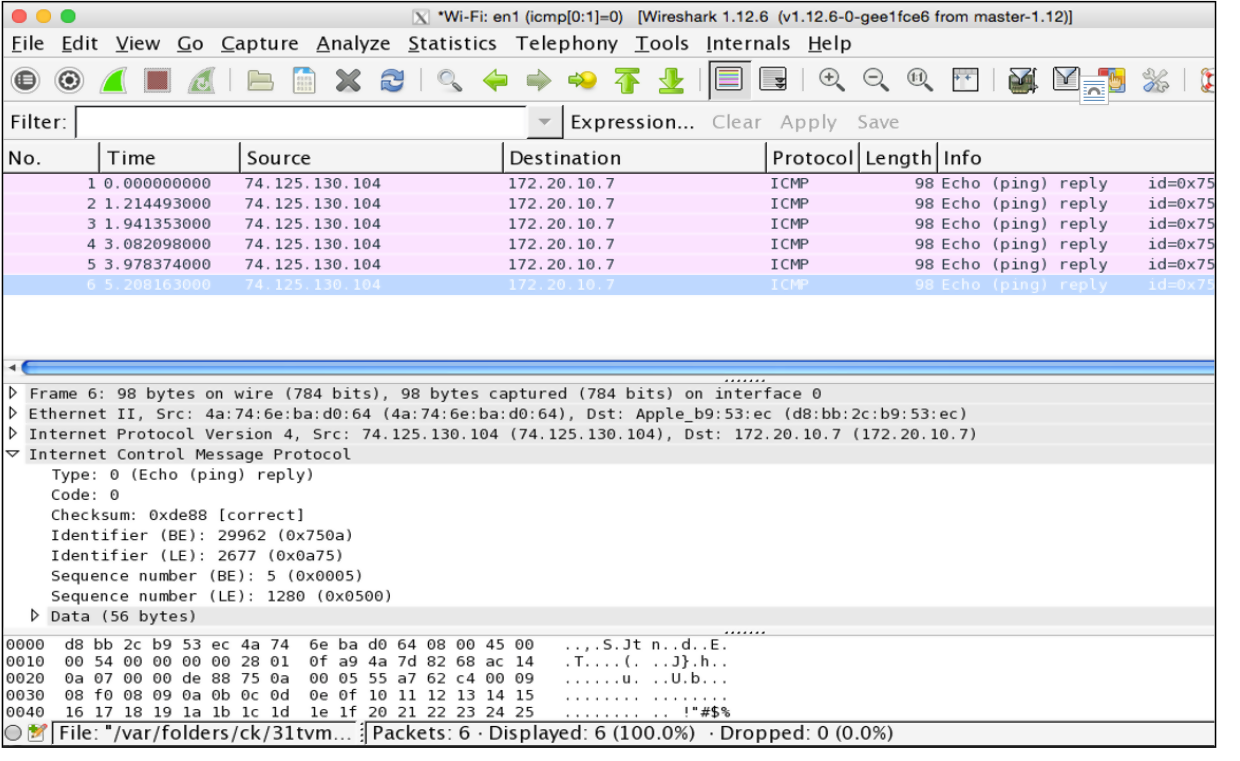 We use this filter and ping google.com, and Wireshark captures the following reply packets in the image below: