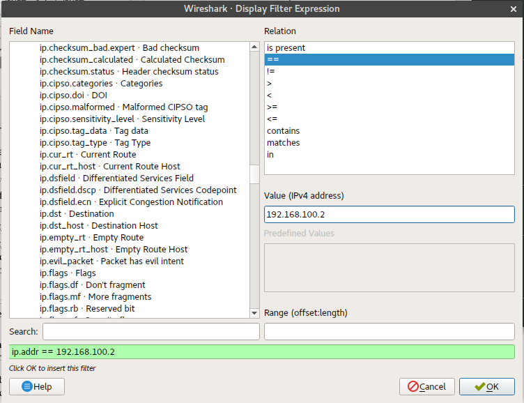 In the image above, we used the field name ip.addr, used the expression == and issued the value 192.168.100.2, which was our IP address. The range box at the bottom allows us to define a range that can refine the filter more. Some protocols may allow this. Ranges may vary, for instance, examples may include 0-5, 1-78 and even 120-255. There are comparison operators and logical operators which are also important in refining searches.