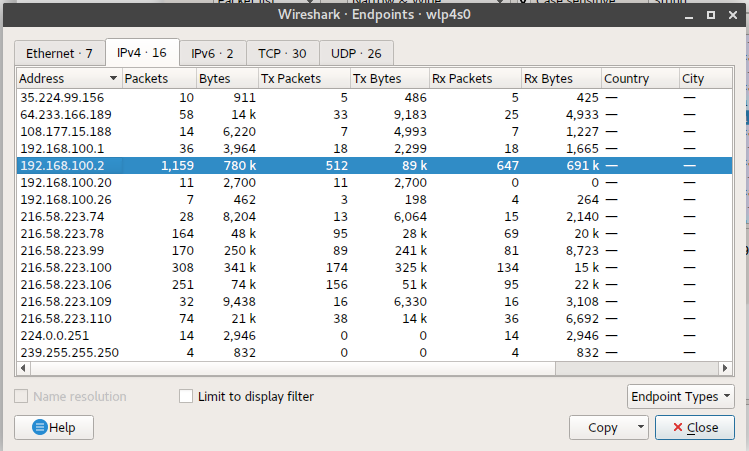 Depending on the packet you select, some tabs may appear disabled and others enabled. Those that appear enabled will be so, since the related protocol will be active. In the screenshot above, we can see that the most traffic-intensive endpoint is 192.168.100.2. We can also note that the IPv4 tab contains 16 endpoints and the Ethernet tab contains 7 endpoints.
