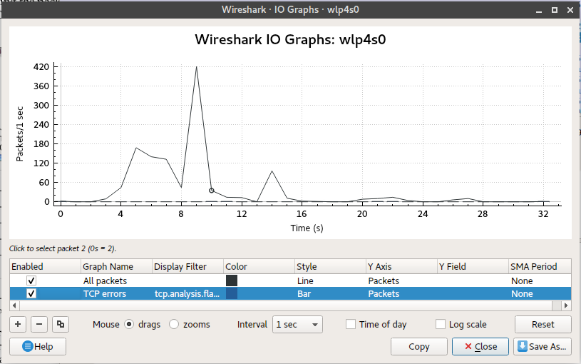 According to the graph above, the data in the x-axis represents the time in seconds and the data in the y-axis represents the packets per tick. You can filter the graph to display graphs based on the time of day, interval and log scale, and you can even reset applied settings back to the default.